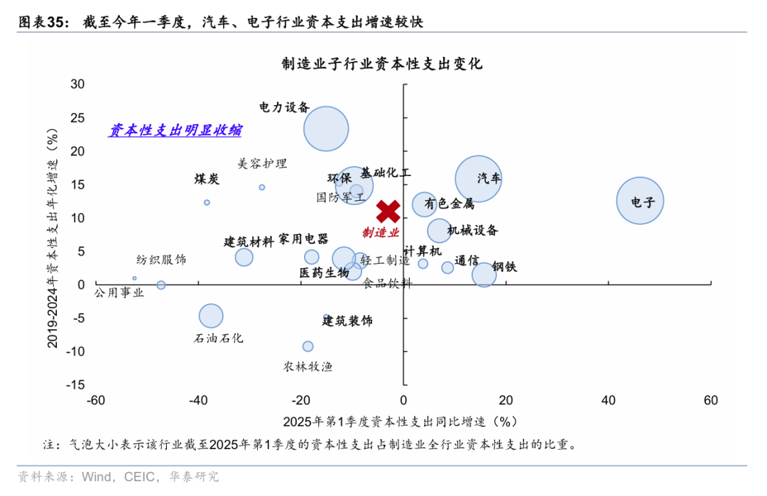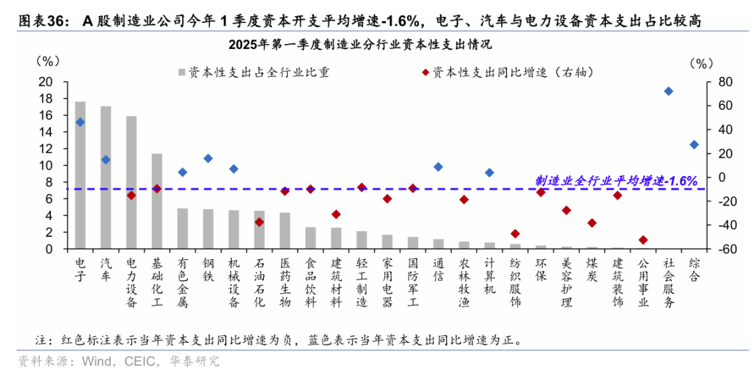 从上市公司资本开支的角度观察:今年一季度A股制造业公司资本开支同比回落1.6%,其中电力设备资本开支增速延续回落态势,而汽车、电子行业资本支出增速较高、较去年同比增速边际提升。电力设备资本开支增速为-15.1%,相比2019-2025年化资本支出增速23.4%大幅回落;电子行业增速为46.2%,远超2019-2025年化资本支出增速12.6%;汽车行业资本开支增速为14.6%,基本和2019-2025年化资本支出增速15.9%持平(图表34-36)。