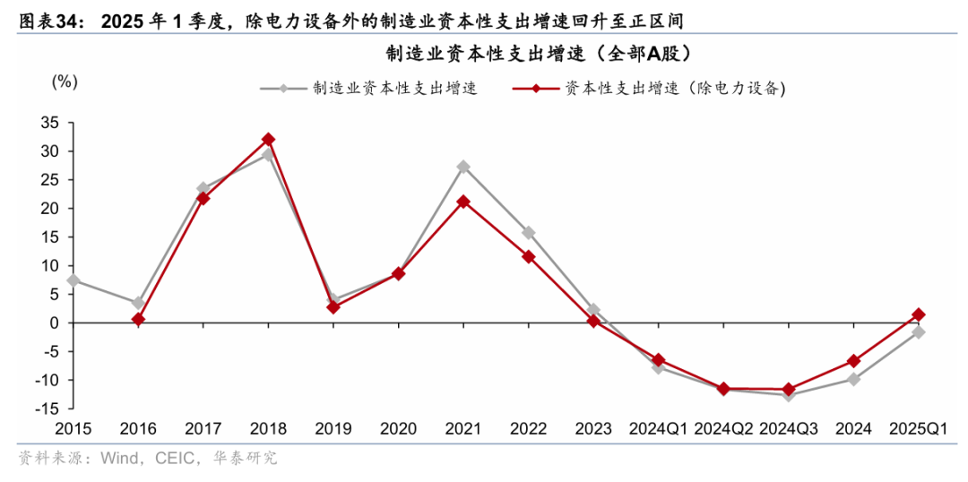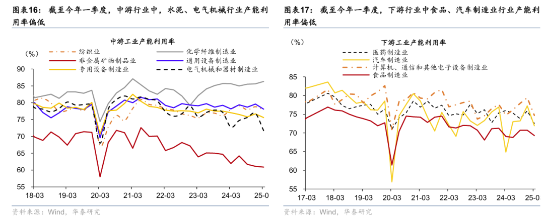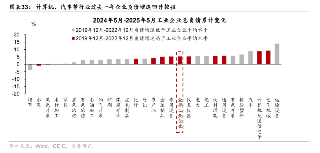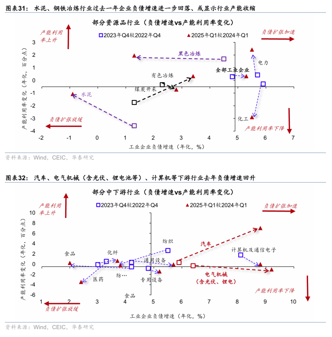 从企业负债增速的视角看产能边际变化:1)水泥、钢铁冶炼行业过去一年企业负债增速进一步回落、或显示行业产能收缩;水泥负债增速在2024Q4至2025Q1中由1.3%降至-0.9%,而钢铁从4.5降至1.3% 2)汽车、电气机械(含光伏、锂电池等)、计算机等下游行业去年负债增速回升,或表明产能边际扩张。汽车负债增速在2024Q4至2025Q1中由5.9%升至8.8%,电气机械由6.4%升至9.2%,计算机由8.1%升至8.8%(图表31-33)。