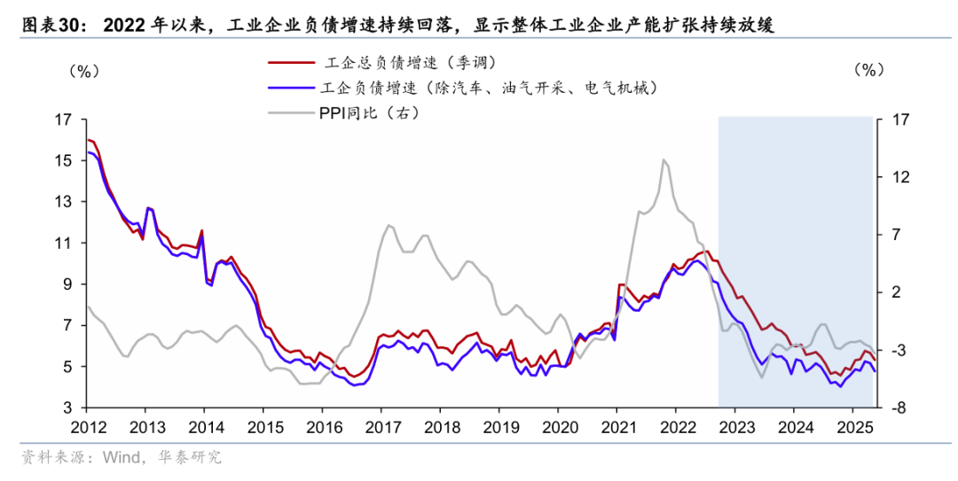 对于去产能效果而言,反内卷行业的有利因素在于相关行业的集中度更高,但不利因素包括国企比例更低、中下游行业偏多,产能更“新”,行业盈利能力各异。本轮“反内卷”产能较2015-2017年供给侧改革时相比更为“先进”,涉及行业在2022年以来进行大幅产能扩张,距今约3-4年,对比此前供给侧改革约6-8年——从2008到2010年间,工业企业总负债的同比增速维持在20%左右的较高增速,亦高于同期的信贷增速,或显示整体制造业企业产能扩张,此后逐步放缓至低个位数水平。2012年以来的 PPI持续下行,导致许多传统行业的杠杆率、资本开支等明显回落,2016年供给侧改革相关行业举措正式推进,距离此轮产能大幅扩张时间约为6-8年。对比而言, 2021年以来制造业负债增速再度回升,或显示产能周期扩张(图表30),而今年以来推进的“内卷式”竞争,距离本轮产能扩张约为3-4年,一定程度上体现出本轮“反内卷”行业产能相对更新。