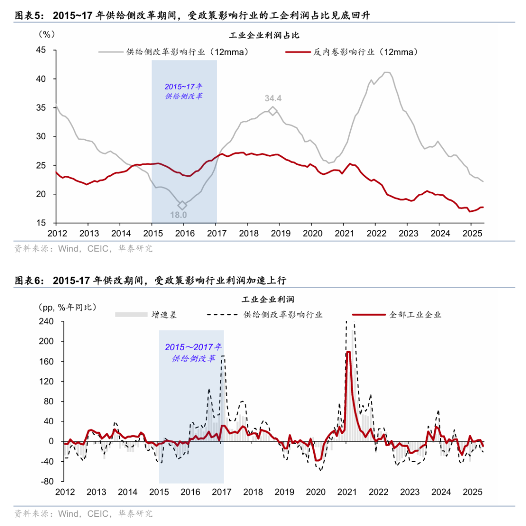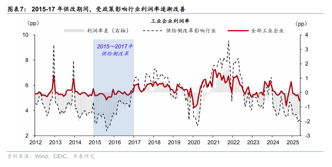 2015-17年的经验表明,“反内卷”结合提振需求侧的政策,有望取得更好效果。一方面,价格向下游传导更加顺畅,PPI回升弹性更大;另一方面,良好的总需求环境下,利润率回升更为明显,支持政策在市场化的背景下退出更为顺畅。2015-17年供给侧改革通过去产能、去库存显著改善企业盈利,叠加同期开展的棚改货币化拉动地产需求、PSL等支持推动基建投资加码等需求侧政策,以及货币政策保持宽松,减税降费减轻企业负担,共同催生2017年A股“小阳春”行情——2017年工业利润增长从2015年的-2.3%回升至2016年的8.5%、2017年进一步回升至21%,2017年沪指上涨6.56%,上证50涨24.0%。