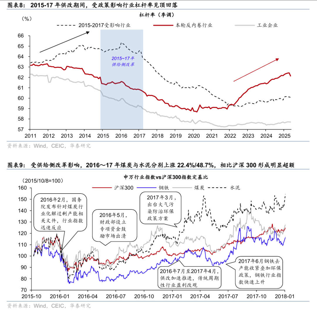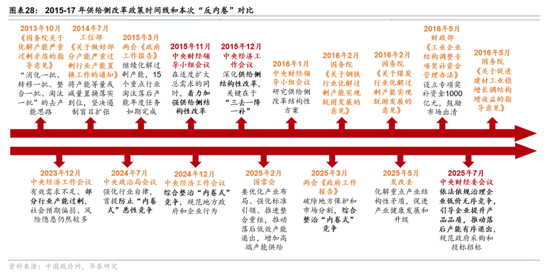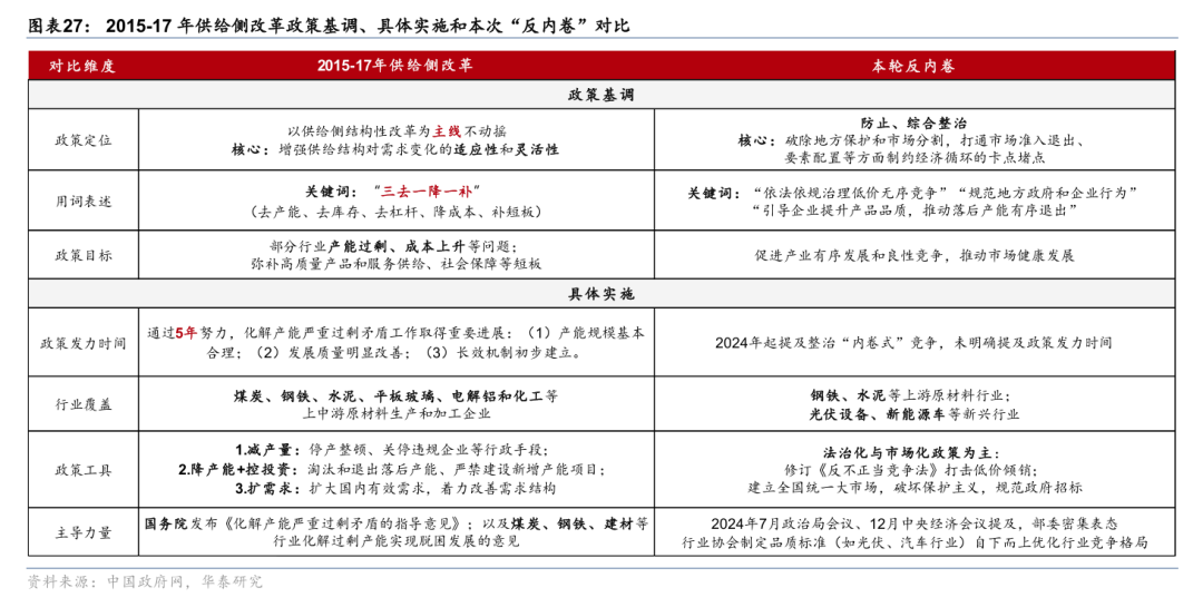 政策工具:2015-17年供给侧改革以行政手段为主,如关停违规企业、严禁新增投资等;本次“反内卷”还有法治化与市场化措施,如修订《反不正当竞争法》打击倾销,引导建立全国统一大市场等。
