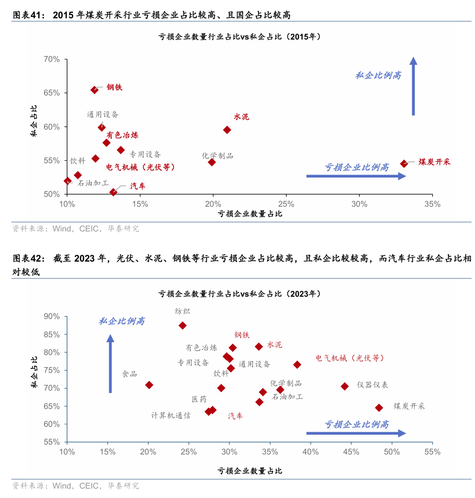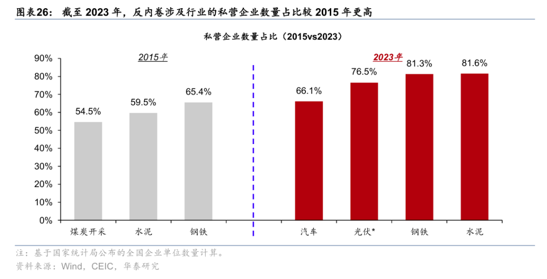 从企业性质而言,本次“反内卷”主要涉及的行业私营企业占比比供给侧改革时期更高。截至2023年,光伏、汽车等新兴制造业的规模以上工业企业中,私营企业数量占比分别录得66%、77%,钢铁和水泥的比例则超过80%,对比2016年,煤炭开采、水泥和钢铁行业的私营企业数量占比分别录得55%、60%、65%,均低于本轮“反内卷”行业的水平。
