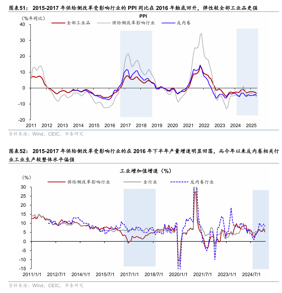 反内卷对PPI的推升可能较供给侧改革更温和,最主要是由于需求侧政策和宏观环境不尽相同——当前需求侧政策“托底”为主,地产周期缺乏全面反弹的动力,且面临对外贸易壁垒上升等压力。同时,考虑到“反内卷”更多涉及中下游行业,产能削减可能影响上游商品需求,对整体通胀水平的拉动或不及给供给侧改革的效果。据IMF测算,供给侧改革的产能削减可能解释同期PPI上涨的40%,其余悉需求回升推动。彼时棚改货币化、货币政策宽松、减税降费、PSL拉动基建投资等需求端政策刺激带动总需求回升,令上游价格传导更为顺畅。