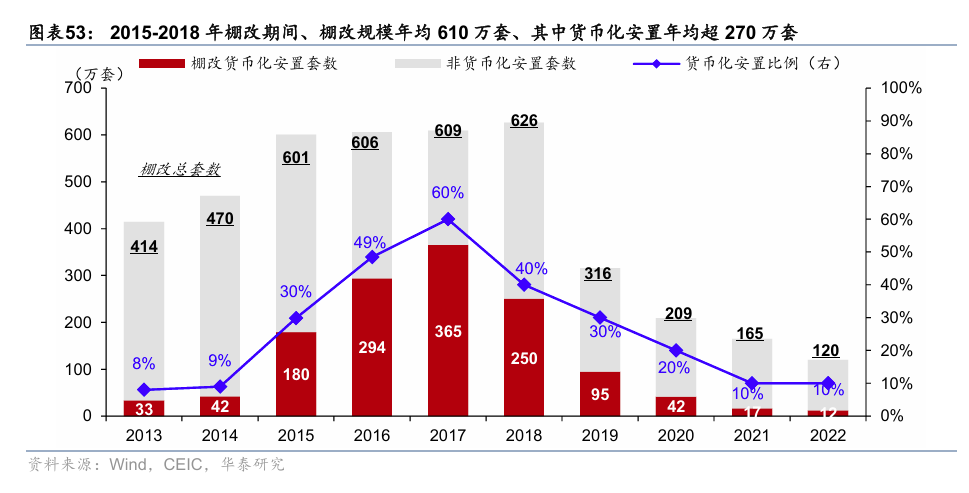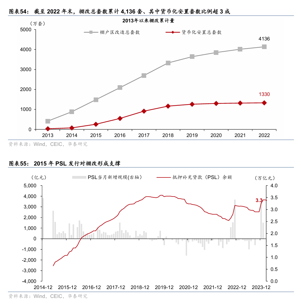 2015年推动供给侧改革以来,为对冲去产能带来的短期经济压力,中央亦通过棚改货币化和基建投资拉动需求:2015年6月17日:《国务院关于进一步做好城镇棚户区和城乡危房改造及配套基础设施建设有关工作的意见》提出2015-2017年改造棚户区1800万套,中央财政加大支持,鼓励政策性银行提供低息贷款。中国人民银行通过抵押补充贷款(PSL)向国开行提供低息资金,2015-2017年PSL新增约2.9万亿元。货币化安置比例从2015年的30%升至2017年的60%,刺激三四线城市地产需求(图表53-55)。