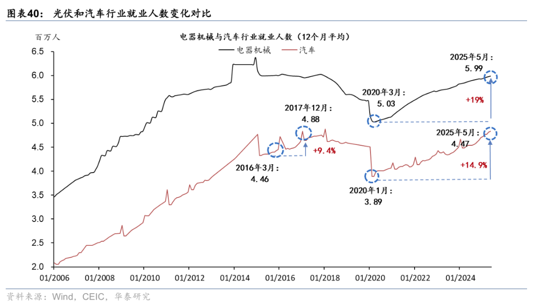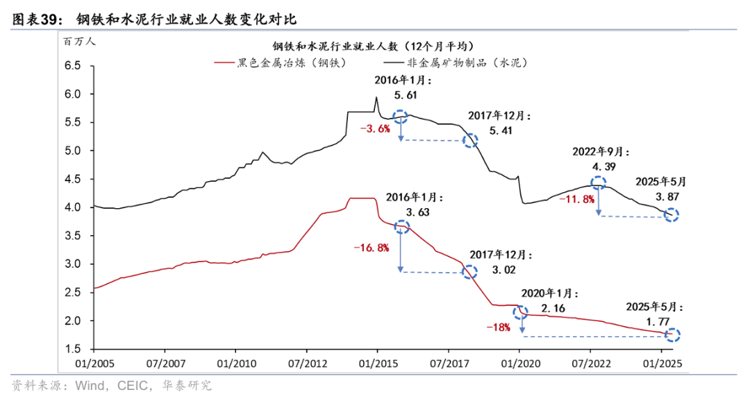 本次“反内卷”主要提及光伏、汽车、水泥及钢铁等,而供给侧改革聚焦煤炭、钢铁等上游传统行业。反内卷相关行业产值占比和供给侧改革时期同为3成,就业人数比重为19%,略低于供给侧改革涉及行业的24%。