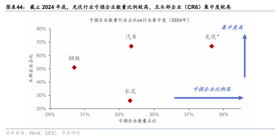 光伏行业亏损企业占比较高,或可通过兼并重组等方式提升行业集中度,有助于优化市场竞争格局、打破“内卷式”竞争的有效举措。比如光伏的硅料环节,头部企业(前6大)集中度达到约67%(图表43),亏损企业占比较高,或可考虑由硅料龙头企业联合成立平台型公司,收购产业链中其他企业产能。收购完成后统一安排生产、销售,协调开工率、产量、库存等,以推动行业供需实现相对平衡。
