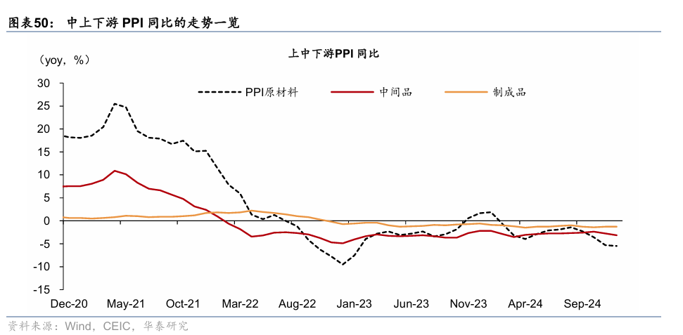 此外,考虑到“反内卷”更多中下游行业,若产量削减、可能对上游需求带来负面冲击、仅为压低部分上游商品价格,对整体通胀水平的拉动或不及给供给侧的效果,但中游利润率可能上升。本次“反内卷”涉及行业总权重约26%,小幅低于2015-17年供给侧改革相关行业的权重31%,且中下游产业占比超过一半,传导效应或不及供给侧改革时期。从价格传导机制来看,上游原材料行业的市场集中度高,价格上涨的传导速度更快、传导程度相对更高,而中下游制造业由于竞争和需求弹性相对较高,对整体价格指标的拉动效果或不及上游涨价[10]。截至今年5月,上游PPI同比相对偏弱,部分受黑色系及油气产业链价格下跌的拖累,同比录得-5.5%,而中间品PPI同比录得-3.2%,自2022年以来维持低位,下游PPI同比录得-1.3%,高于整体PPI水平(图表50)。