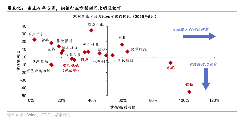 水泥:行业集中度较为分散,但行业整体亏损额占比亦较高,在行业自发产能出清的调整下,今年以来亏损额同比亦小幅回落,叠加政策推动供给优化,或有望对企业盈利温和改善形成支撑。