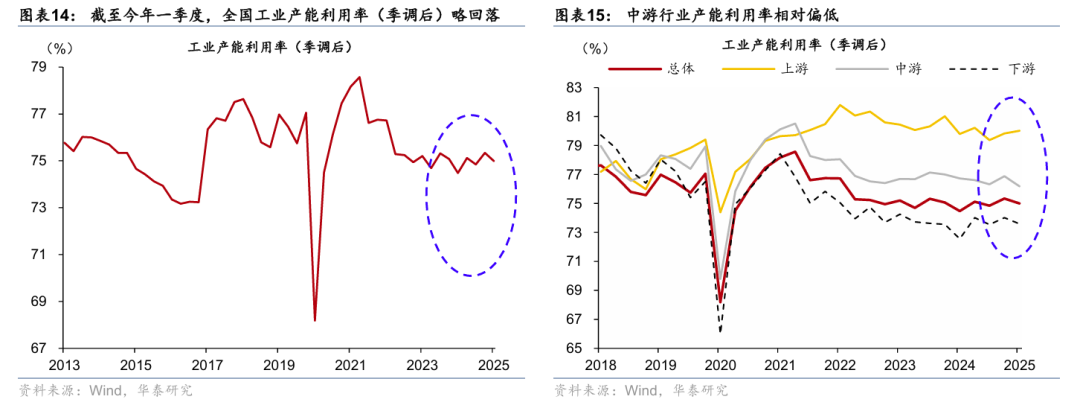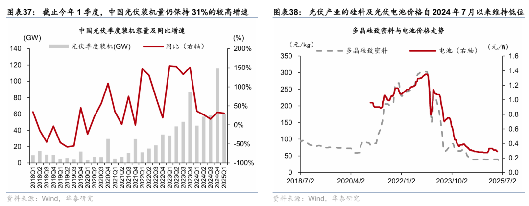 本轮“反内卷”相关行业整体产能扩张增速较供给侧改革前的扩产周期相比有所放缓。结合工业企业负债及上市公司的资本开支数据,我们发现,2022年以来PPI低位运行下,光伏、钢铁、水泥等行业产能扩张已明显降速,但光伏装机量仍保持31%较高增速、而硅料及光伏电池价格持续地位,显示存量产能及需求仍形成较大错配压力。2016-2017年期间,钢铁、煤炭和水泥等行业基本暂停了新项目的批复备案,在落后产能淘汰之外亦对新增有所控制、加速结构调整。我们用统计局发布的工业企业负债数据作为总产能变化走势的一个替代指标,发现今年一季度制造业产能扩张仍趋缓,尤其是水泥、钢铁产能或持续收缩,电力设备产能增速回落。值得注意的是,由于企业有较为可观的利息支出及折旧成本等,总负债扩张速度往往快于产能。此外,我们亦根据上市公司披露财务数据中,资本性开支的增速观察企业产能扩张行为。