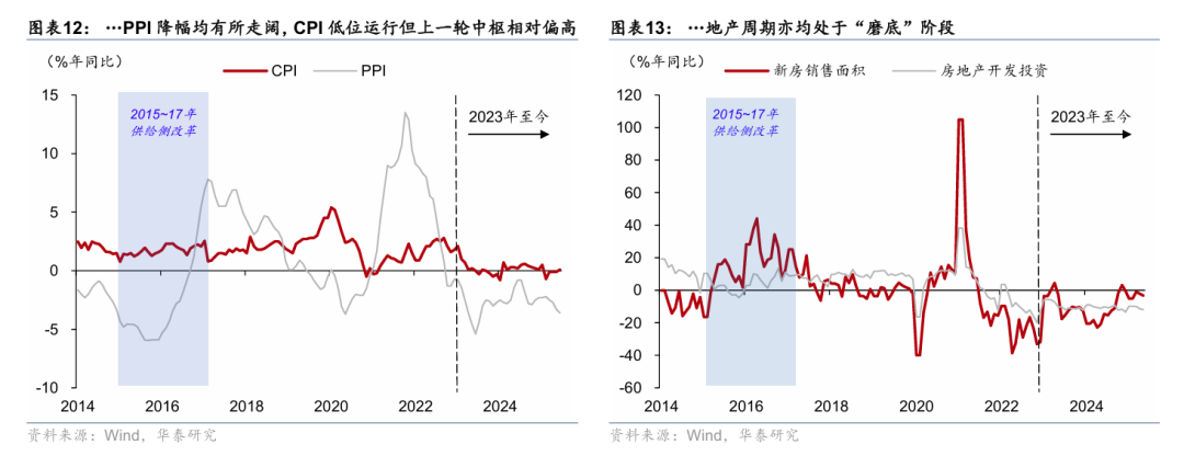 2015-2017年供给侧改革前与当前中国PPI降幅均有所走阔。上一轮供给侧改革前,PPI从2014年7月的-0.9%快速下行至2015年9月的-6%,但CPI在0.8%~2.3%区间内窄幅震荡、整体保持温和。当前PPI自2022年10月转负以来低位运行,CPI自2023年4月降至0.1%以来在0附近震荡、运行中枢相较上一轮供给侧改革前偏低,内外需偏弱导致通胀持续承压(图表12)。