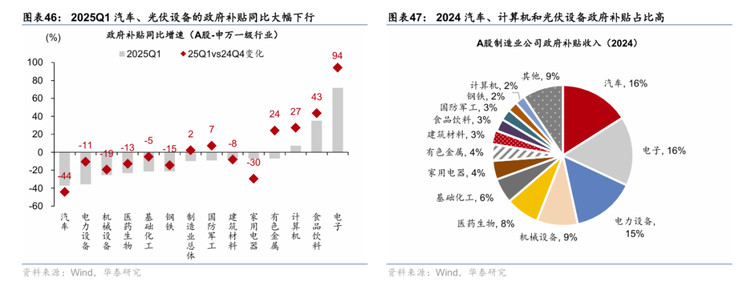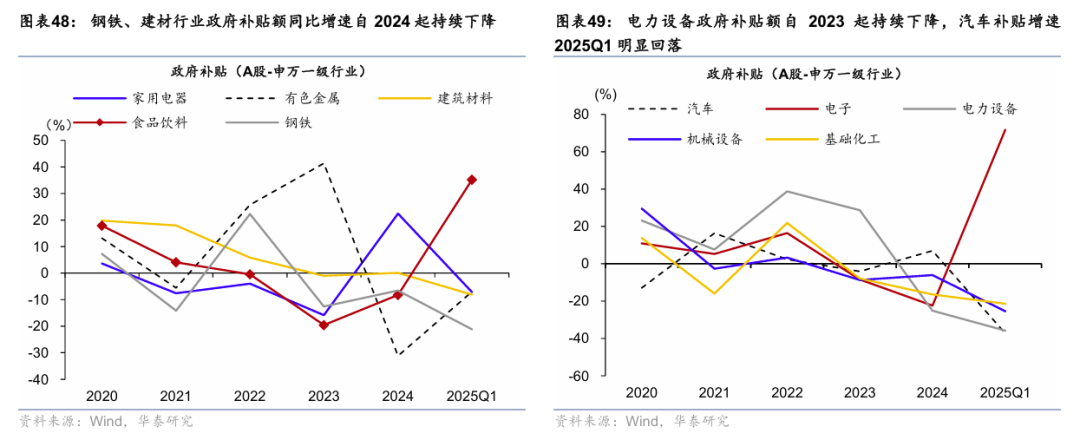 分行业来看,在政府补贴退坡的背景下,对政府补贴依赖度高的行业或受到较大影响,比如汽车、计算机和光伏设备等行业。根据2024年年报数据,汽车、计算机、光伏设备等行业的利润总额对政府补助依赖程度较高,且今年1季度汽车、光伏设备政府补贴力度退坡较快。此外,从申万一级行业指数来看,建材和光伏设备等行业政府补贴额同比增速近年来持续放缓,而计算机行业政府补贴在今年1季度跳升,可能反映在发展新质生产力、“人工智能+”投资背景下地方政府倾向补贴高技术行业。