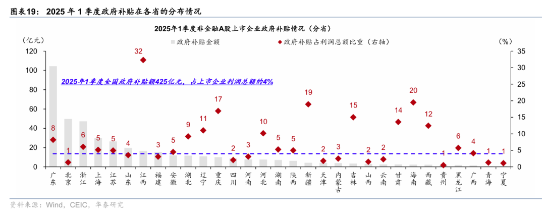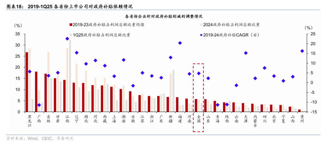 2024年统一大市场政策推进后,部分省份对政府补贴依赖程度明显下降。对比2019-2023年、2024年全年和2025年1季度政府补贴占利润总额比重,福建和天津在2019-2023年政府补贴金额年化复合增速较高,且2024年全年和2025年1季度占利润总额比重较2019-2023年均值有明显下降;此外,黑龙江、广西、吉林和甘肃等24地2025年1季度政府补贴占利润总额比重均低于2024年全年水平。而江西、广东和新疆等地2025年1季度政府补贴占利润总额比重较2024年仍在上升,且比重高于全国均值(图表18-19)。