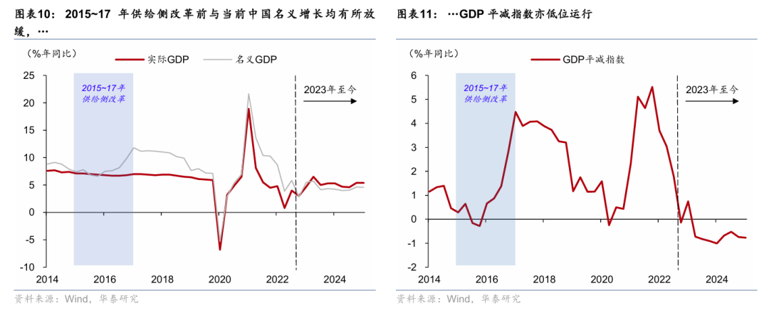 2015-2017年供给侧改革前与当前中国宏观经济均呈现名义增长放缓和物价低位运行的特征。回顾供给侧改革前,名义GDP同比增速从2014年2季度的9.1%回落至2015年4季度的6.6%,GDP平减指数也从2011年3季度的9.1%放缓2015年4季度的-0.3%。本轮名义GDP自2022年开始放缓,从2022年1季度的8.7%下滑至2024年2季度的4%(图表10);与此同时,GDP平减指数亦从2023年2季度起转负,内外需求放缓导致当前物价承压(图表11)。
