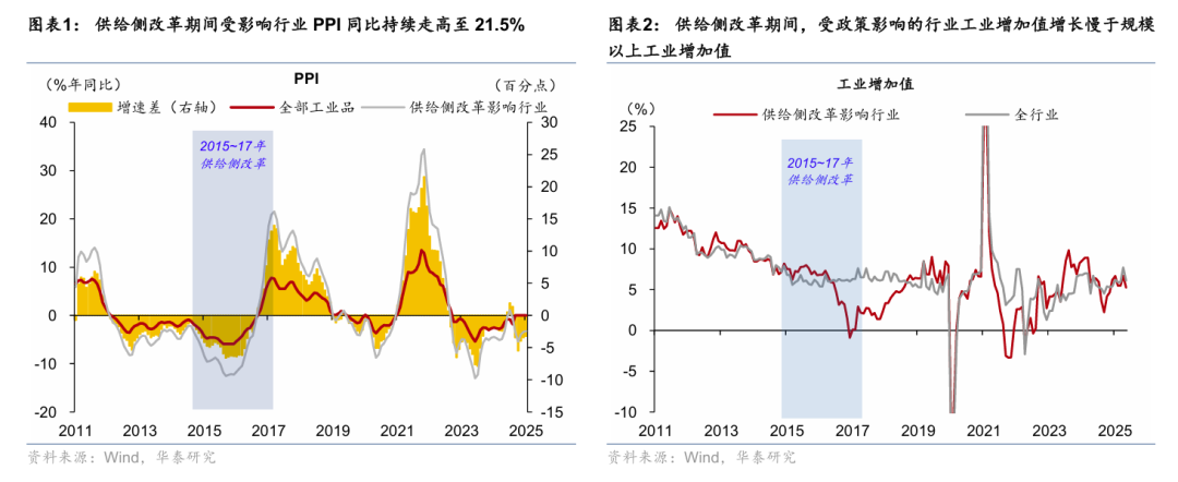 反内卷对PPI的推升可能较供给侧改革更温和,主要由于需求侧政策和宏观环境不尽相同。当前需求侧政策以托底为主,而地产周期仍在磨底、外贸易壁垒上升。反内卷涉及中下游行业偏多,对PPI拉动或将不及供给侧改革。与供给侧改革时期类似,反内卷可能压低相关行业的总产出。