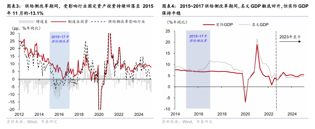 增长方面,名义GDP增速受PPI快速上行提振,而实际GDP增速受去产能影响拖累略有放缓。名义GDP同比增速从2015年最低点的6.6%快速回升至供改期间的高点11.8%,传统行业产出收缩拖累实际增长,实际GDP同比增速从2015年的7%略放缓至2017年的6.9%,年化拖累GDP增速约0.1-0.2个百分点(图表4),但中长期看,部分学者(李平和娄峰,2016;陈素梅和李鹏,2020)算供给侧改革将提振实际GDP增长0.3~2.6个百分点左右。