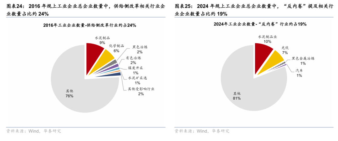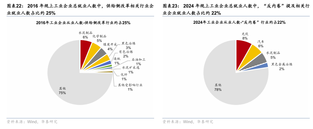 就业人数和企业数量来看,供给侧改革相关行业在2016年规上企业工业企业数量/就业人数中的比例略高于本次反内卷涉及行业的对应占比。具体而言,2016年规上工业企业总就业人数/企业数量中,供给侧改革相关行业企业就业人数占比约为24%/25%,对应本次反内卷行业在2024年规上工业企业总就业人数/企业数量中占比19%/22%。