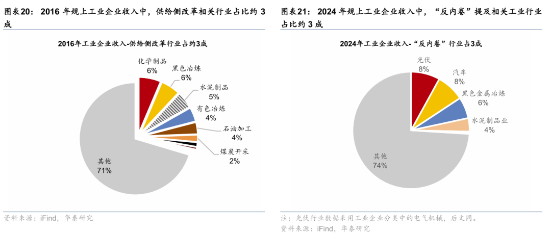 我们基于规模以上工业企业营业收入计算行业占比,结果发现,供给侧改革相关行业在2016年规上企业收入中的比例约为3成,与本次“反内卷”涉及行业占比体量总体相当。截至2024年,光伏设备、汽车行业均占全年规模以上工业企业收入总额的约8%,钢铁和水泥制品制造业的占比分别为6%/4%,合计近3成,对比2016年工业企业收入的占比重,化工和钢铁分别占6%,而水泥制品、电解铝、石油加工等分别占比达到4%-5%,整体规模亦占3成左右。