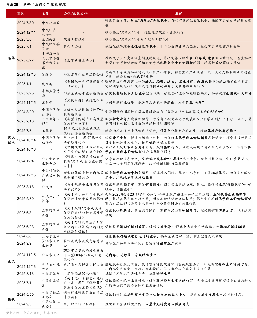 分行业举措而言,本轮“反内卷”目前主要是工信部和行业协会的倡议,约束力较为有限,但不排除后续有进一步政策加码(图表29),具体看: