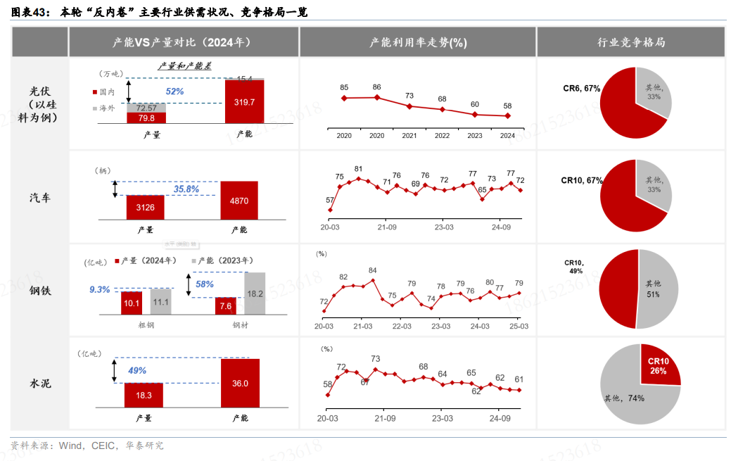 此外,依托全国统一大市场建设,规范招商引资,破除地方保护和市场分割,对部分行业的违规的补贴、税收优惠等退坡,亦可能促进汽车、光伏等行业产能调整。根据7月9日求是网的发文评论《“内卷式”竞争的突出表现和主要危害有哪些?》[8],内卷式竞争不仅体现在企业层面,也体现在地方政府行为层面,地方政府行为包括1)招引企业、培育产业,人为制造政策洼地,违规实施税费、补贴、用地等不公平非普惠的优惠政策,导致无序竞争;2)不顾地方产业基础和资源禀赋情况,盲目上马新兴产业、重点产业,造成行业内大量重复建设和生产过剩;3)为保护本地市场、扶持本地企业,设置或明或暗的市场壁垒,区别对待各类企业,破坏公平竞争秩序。因此,破除地方政府之间不公平竞争带来的部分违规税费、补贴等优惠待遇亦可能作为一种顺应市场化、法制化的政策调控手段。